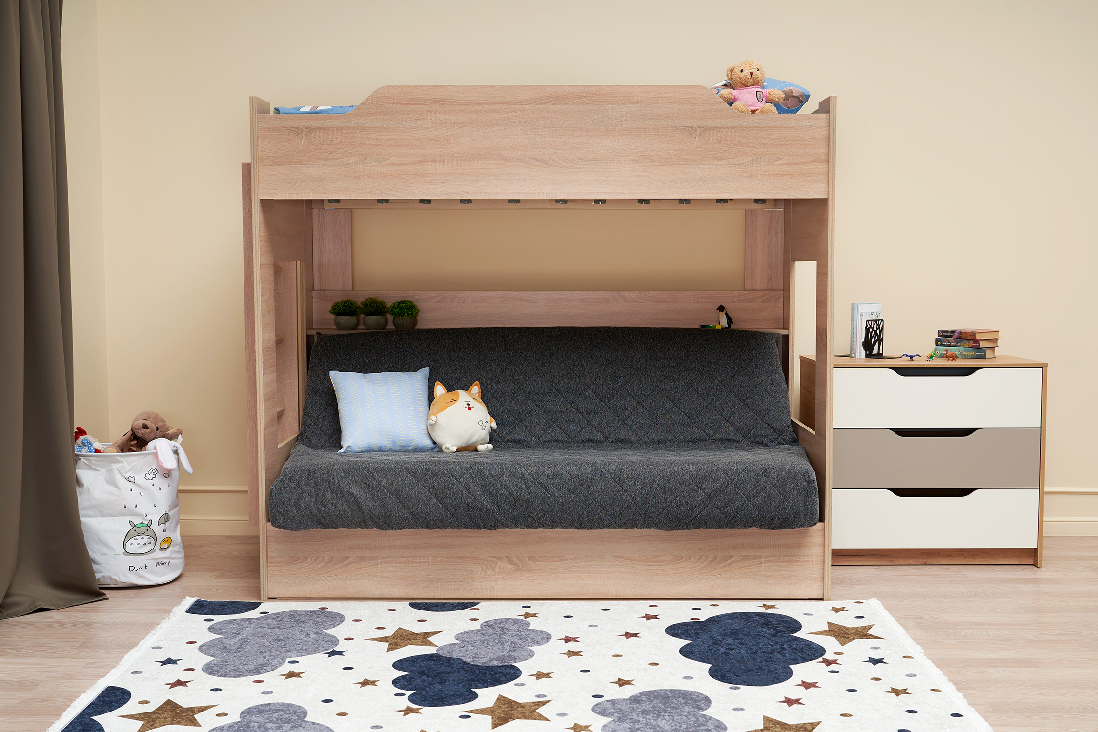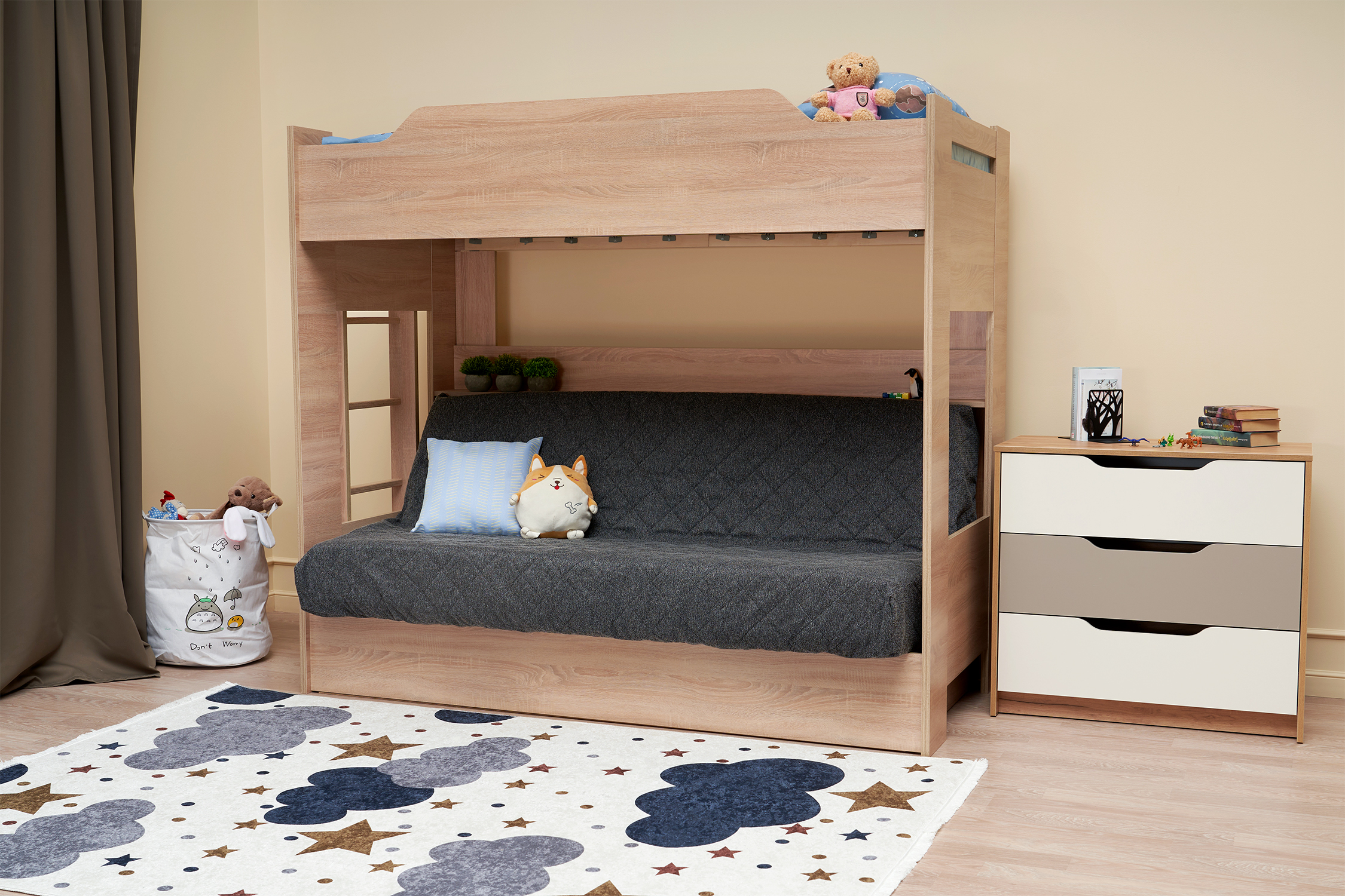Механизм трансформации дивана: «Книжка». Рекомендуемая высота матраса на верхний ярус 17 см. Максимальная нагрузка на верхний ярус 50 кг. Лестница может быть установлена с обеих сторон кровати. Высота бортика 30 см. Максимальная нагрузка на нижний ярус 90 кг. Чехол съемный.