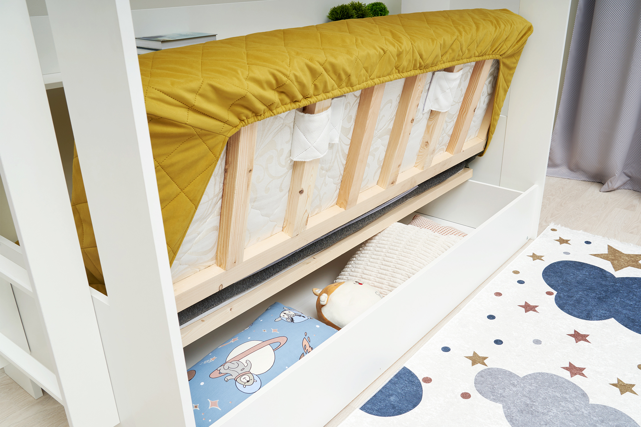 Механизм трансформации дивана: «Книжка». Рекомендуемая высота матраса на верхний ярус 17 см. Максимальная нагрузка на верхний ярус 50 кг. Лестница может быть установлена с обеих сторон кровати. Высота бортика 30 см. Максимальная нагрузка на нижний ярус 90 кг. Чехол съемный.
