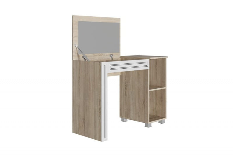 Особенности стола: Материал корпуса - ЛДСП 16 мм., материал фасада - МДФ 16 мм. Стол состоит из закрытой тумбы с полкой справа и потайного отсека для хранения, при открывании которого появляется зеркало, расположенное на обратной стороне открывающейся крышки. Крышка открывается при помощи газлифта.