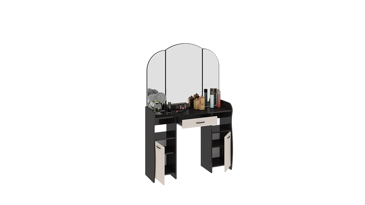 Лаконично простой и элегантный туалетный столик обладает не только эстетичным видом, но и достойной практичностью. Модель отличается эргономичной конструкцией и элегантной формой деталей. Вместительный ящик, столешница, большое зеркало и полки расположены на удобном уровне. Использование двух цветов в дизайне модели делает её оригинальной и позволяет использовать в любом интерьере.